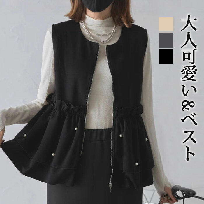 ベスト ジレ トップス カットソー レディース フリル 秋 冬 春 ノースリーブ 可愛い 無地 シンプル きれいめ フリーサイズ ゆったり 体型カバー 学生 30代 40代 50代 通勤