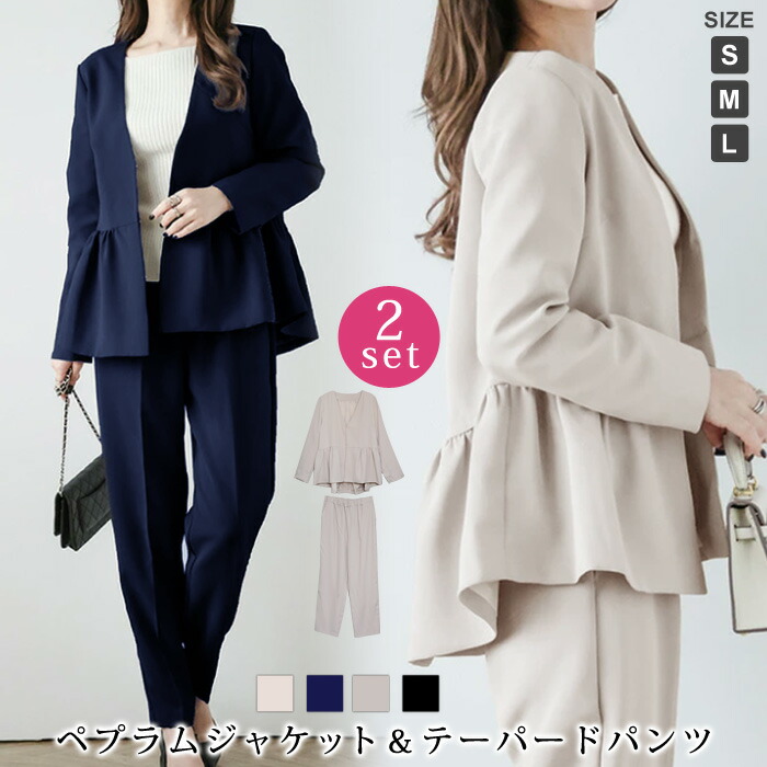 セットアップ レディース スーツ 秋 冬 秋冬 2点セット 紺 ジャケット パンツスーツ セット スーツ 上下セット ロング テーパードパンツ ペプラム ロングパンツ ベージュ ネイビー