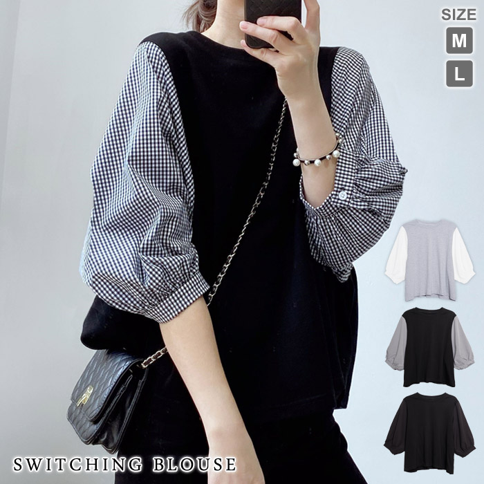 ブラウス レディース 春 夏 春夏 黒 シャツ ブラウスシャツ ドッキング 5分袖 ドルマンスリーブ トップス チュニック 無地 きれいめ グレー ブラック チェック 大人 20代 30代 40代