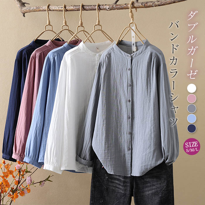 バンドカラー ガーゼ シャツ ダブルガーゼ 綿100% 秋 春 夏 シャツブラウス レディース ブラウス 長袖 ガーゼシャツ トップス ガーゼコットン カジュアル ナチュラル