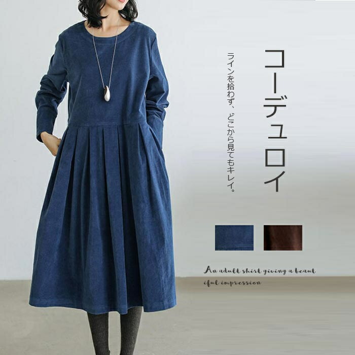 ロングワンピース ワンピース レディース 秋冬 コーデュロイ 長袖ワンピース ロング きれいめ 長袖 ミモレ丈 冬 aラインワンピース 大きいサイズ ゆったり ポケット付き ギャザ ミモレ丈ワンピース