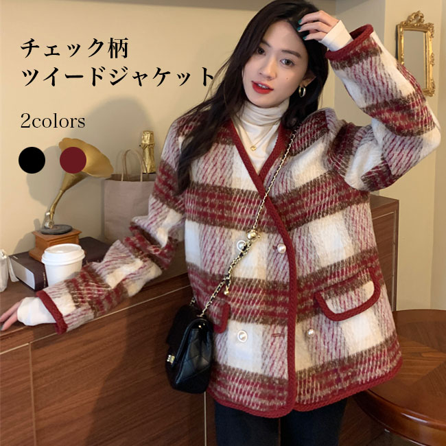 ツイードジャケット レディース チェック柄 ジャケット 厚手 ノーカラージャケット 冬 秋 アウター レトロ 長袖 チェック柄ジャケット ハーフコート 厚手ジャケット 冬ジャケット ツイード