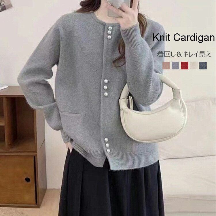 ニット カーディガン レディース 春 秋 冬 羽織り ショートニット トップス 羽織 長袖 ニットカーデ アウター ゆったり ミディアム丈 中厚手 無地 シンプル クルーネック 防寒 大人 前 伸縮性