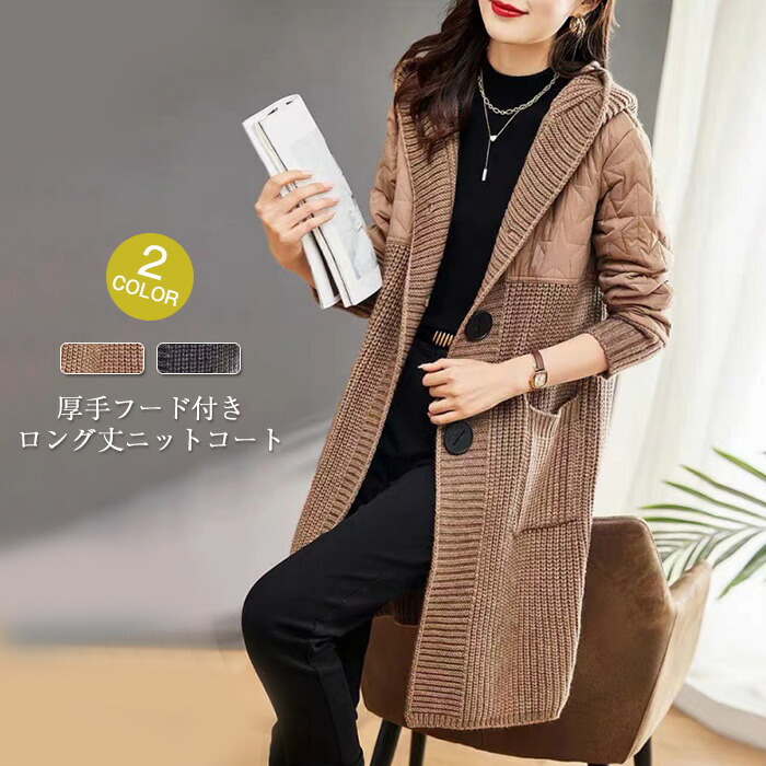 コート レディース フード付き ニット 春 秋 カーディガン 厚手 アウター ロングコート ロング丈 ジャケット 切り替え 大きいサイズ 大人 シンプル 着回し 防寒 ゆったり