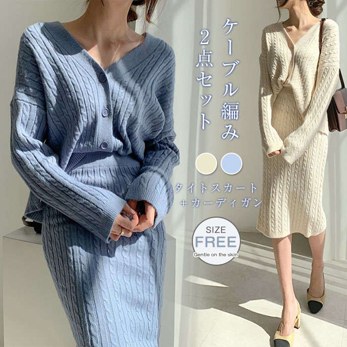 セットアップ レディース 秋 冬 ケーブル編み 2点セット ニットカーディガン+タイトスカート これからの季節に大活躍、単品も可愛い!