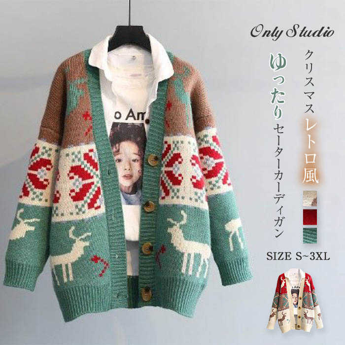 【送料無料◎宅配便発送】ニット セーター カーディガン コート 羽織り レディース クリスマス 新作 秋 冬 トップス ネック 長袖 鹿 花柄 ボーダー 厚手 前開き ボタン ゆったり 通勤