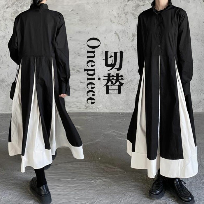 ロングワンピース 長袖 秋冬 レディース シャツワンピース 切替 きれいめ マキシワンピース 長袖ワンピース Aライン 春秋 フレア ビッグシルエット ゆるっと ゆったり 大人可愛い 着痩 カジュアル
