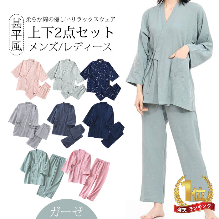 甚平 レディース 上下セット ルームウェア パジャマ ガーゼ 2点セット 便利服 寝巻き 浴衣 和風 七分袖 メンズ 綿 長ズボン ナイトウエア ゆったり 通気性抜群 部屋着 涼しい 柔 前開き