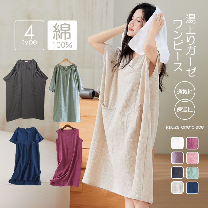 湯上り ガーゼ ワンピース ルームウェア レディース パジャマ 夏用 着 タオル長袖 ダブル 半袖 ガウン綿100% 部屋着 ミモレ ルームワンピース