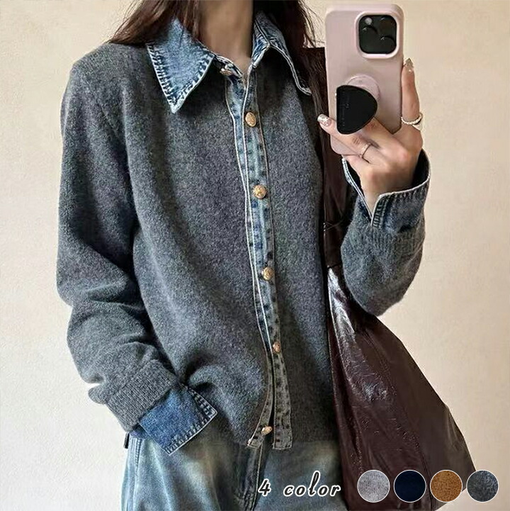 2B4 デニム切り替え ニットカーディガン レディース 切り替え 異素材 ニットセーター カーディガンレイヤード トップス 通勤 カジュアル 重ね着風 前開き