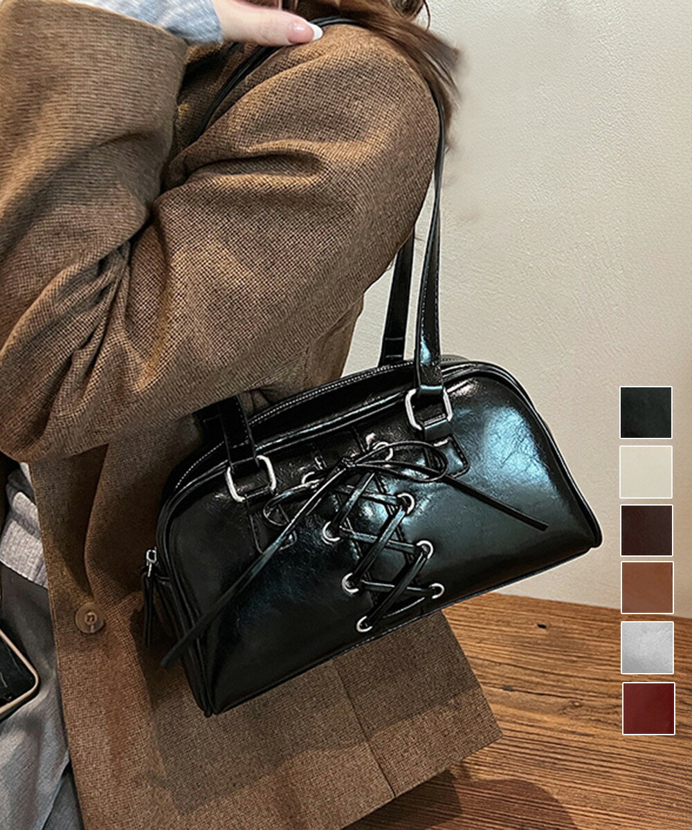 合皮バッグ 小さめ/可愛い肩掛けバッグ/横長ボストンバッグ