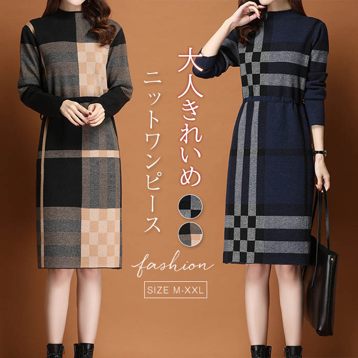 ワンピース 秋冬 きれいめ ニットワンピース 冬 チェック ボーダー ひざ丈ワンピース ハイネック 長袖 ニット 配色 ミディアム 膝丈 ミディ丈 大人 カジュアル フォーマル きれい 春