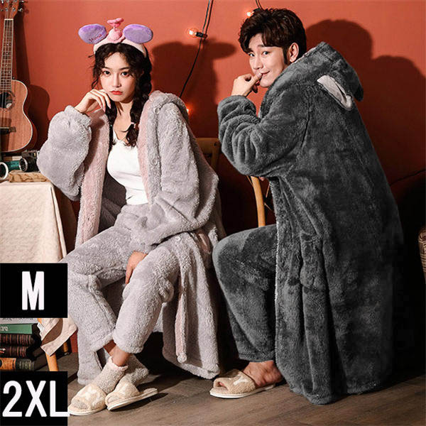 ペアパジャマ もこもこ ガウン 着る毛布 メンズ レディース ナイトガウン モコモコ カップル フランネル バスローブ ローブ ロング丈 ルームウェア うさ耳付き 寝巻き 裏起毛 部屋着 ナイトウェア