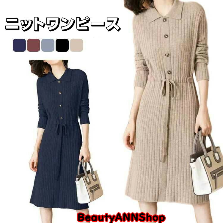 黒ワンピー ワンピース レディース 膝丈 ニット ニットワンピ ロングワンピース 長袖 秋冬ワンピース フォーマル フロントボタン ウエストリボン キレイめ 暖かい 上品 50代 4 厚手
