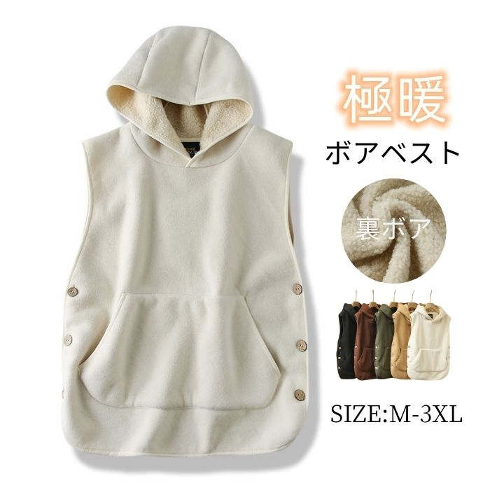 ボアベスト フード付き 裏ボア もこもこ レディース メンズ パーカー ノースリーブ 男女兼用 ジレ ボア ストリート 無地 秋冬 トップス 重ね着 プルオーバー サイドボダン 暖かい レイヤード