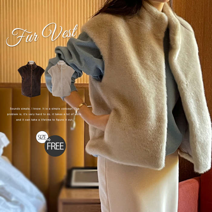 スタイリングを今っぽくアップデートしてくれる 今期注目の フレンチ袖 フェイクファーベスト 20代 30代 40代 50代 フリーサイズ ブラウン 茶 ベージュ 春 秋 冬 送料無料 ♪