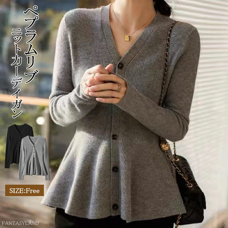 トップス カーディガン ニット リブニット ペプラムトップス ペプラムカーディガン vネック 長袖 羽織 体型カバー ペプラムリブニットカーディガン ボタン