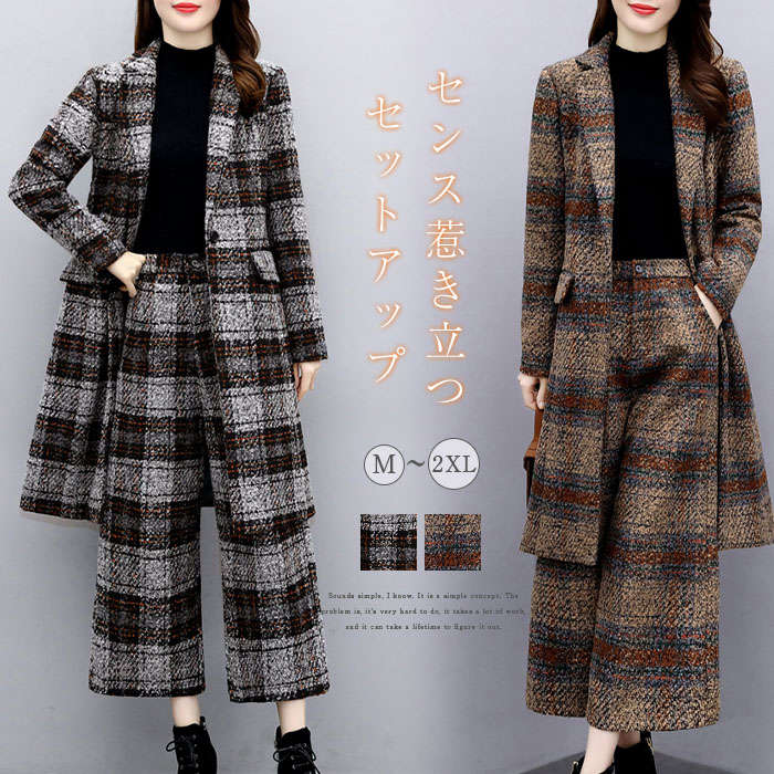パンツスーツ レディース スーツ セットアップ レディース チェック柄 ツイードスーツ 厚手 ジャケット ロング丈 パンツ ワイドパンツ ロング コート 長袖 フォーマル