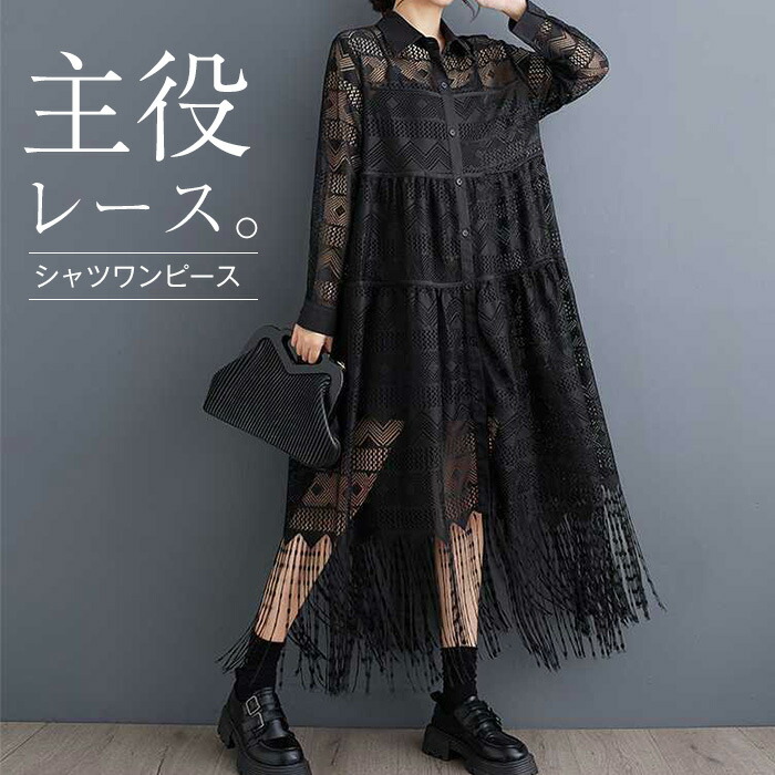 レース 総レース 透け感 レース切替 ライン 膝丈 膝下 長袖 シャツワンピース ロング シンプル 体型カバー重ね着 ゆったり