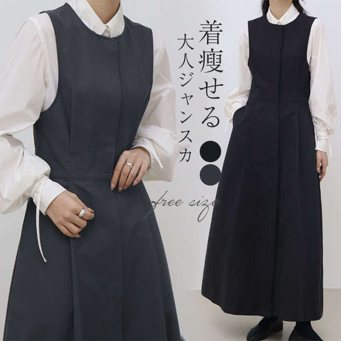 ジャンパースカート 春 秋 レディース ワンピース Vネック ロング丈 ジャンスカ Aライン ウール混 ノースリーブ 重ね着 可愛い 大きいサイズ カジュア 体型カバー