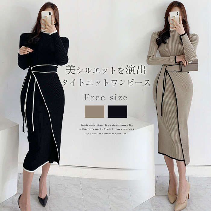 ニットワンピース レディース ワンピース タイト タイトワンピ 長袖 無地 ニット 膝丈 通勤 オフィス チュニック カットソー 秋 タイトワンピース ロング ミディアム 冬