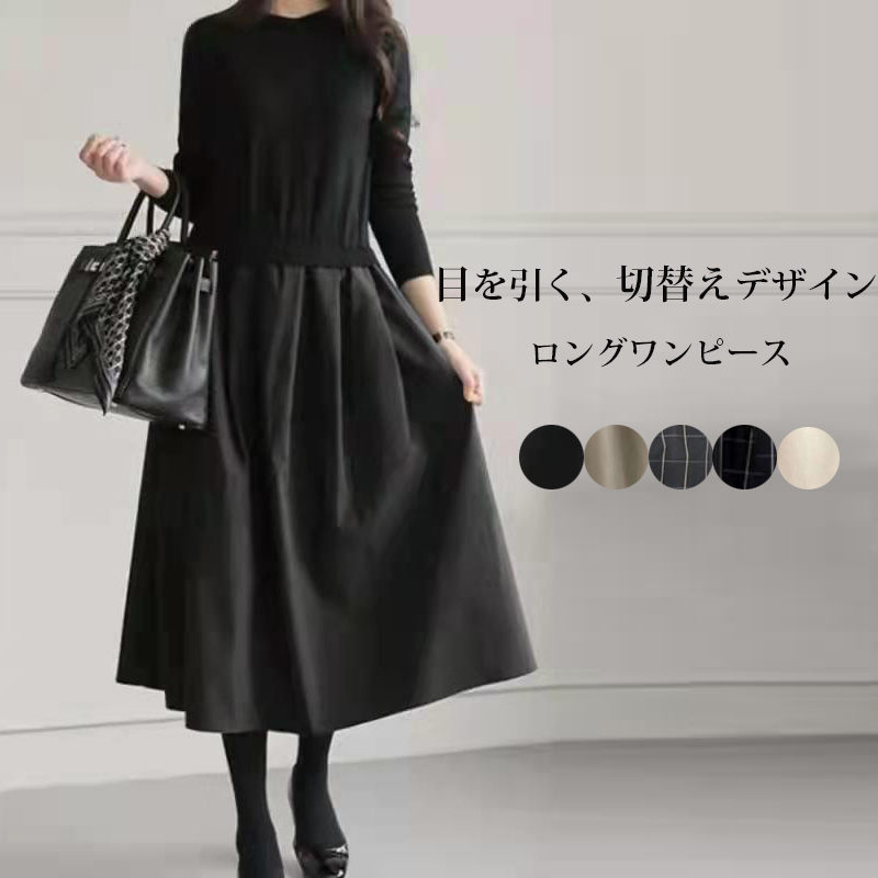 ワンピース きれいめ ロングワンピース 春先 秋 冬 長袖 ニットワンピース ロング 切り替え ニット おしゃれ ドッキングワンピース ワンピ Aライン ドッキング 大きい フレア