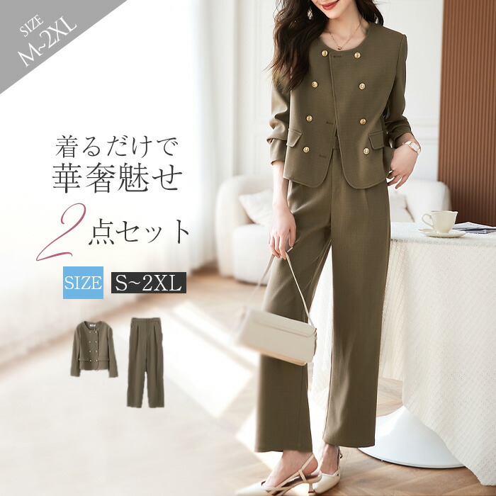 パンツスーツ セットアップ レディース 2点セット ジャケット ノーカラー ワイドパンツ 春 秋 ビジネス スーツ 大人可愛い ノーカラージャケット 着痩せ カジュアル 女性らしい きれいめ シンプル