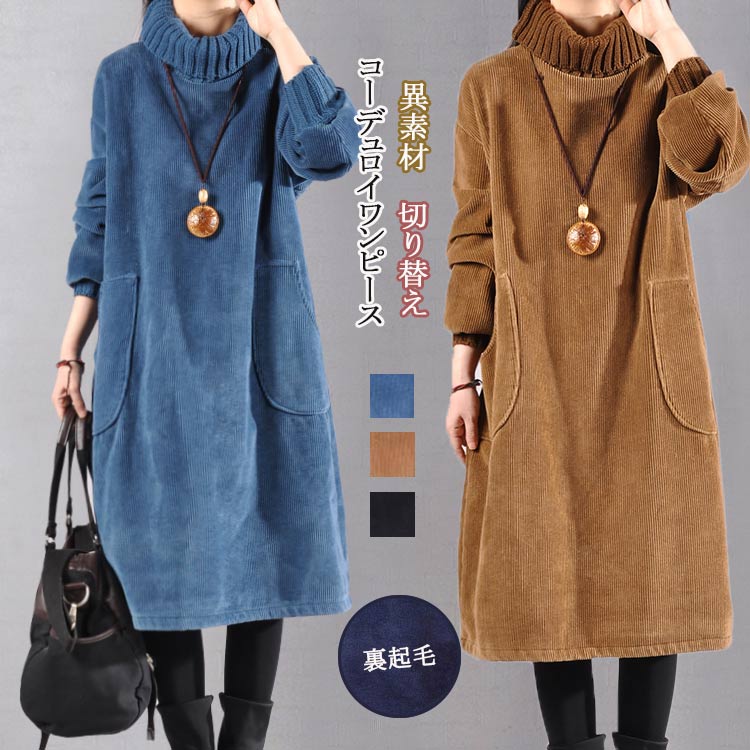 裏起毛 コーデュロイワンピース レディース 秋冬 チュニックワンピース ハイネック 長袖 リブ きれいめ コーデュロイ 無地 切り替え 防寒 カジュアル 暖かい 30代 40代 50代
