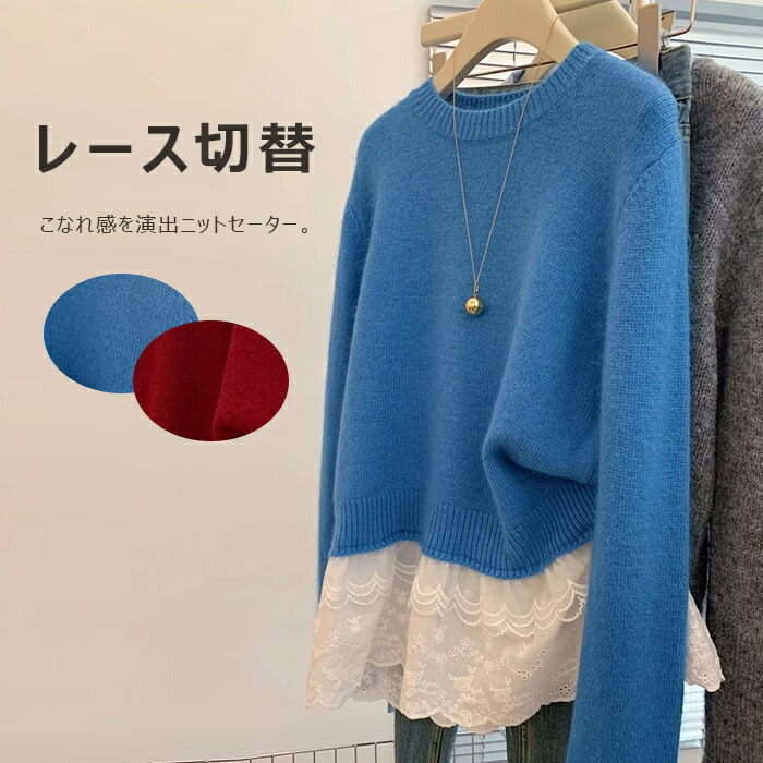セーター ニット 切替セーター レディース ニットセーター 切り替えセーター 長袖 秋冬 ニットトップス レース切替 アウター インナー プルオーバーセーター ラウンドネック