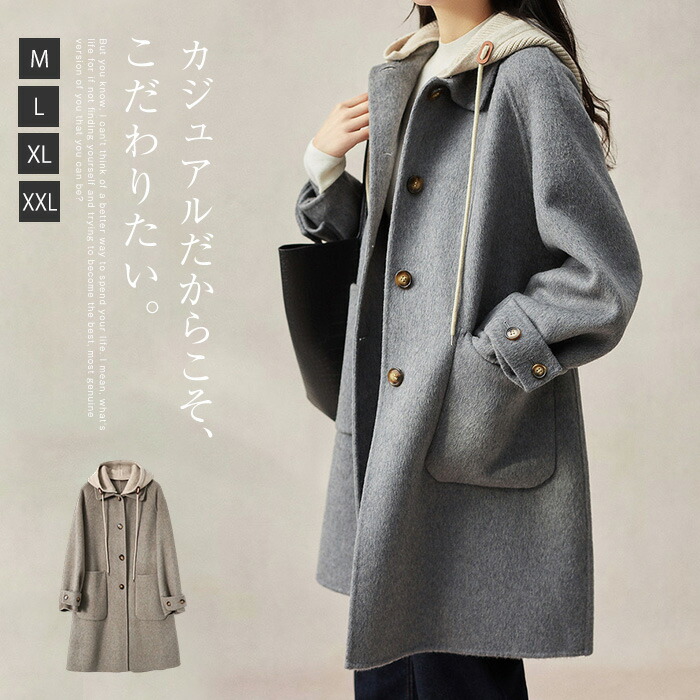 チェスターコート レディース 秋 冬 ロング コート アウター フード付き ウール混 ジャケット 長袖 羽織り ゆったり 大きいサイズ ミドル丈 ポケット付き 暖かい 防寒 スプリングコート