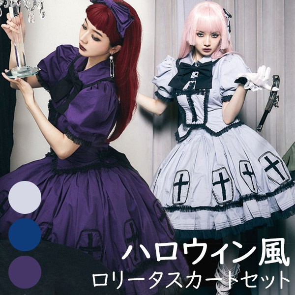 ロリータ スカート ハロウィン セット 魔女風 ウイッチ ゾンビ 膝丈 レディース ゴスロリ ロリータファッション 半袖 ロリータワンピース ワンピース コスチューム コスプレ 可愛い 仮装 ゴ 衣装