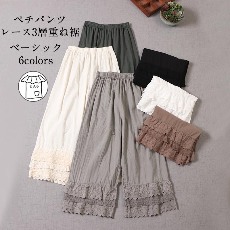 ペチパンツ 九分丈 レディース パンツ ペチコート ボトムス インナー レイヤード 重ね着 レース 3段レース シンプル ロング マキシ 下着 体型カバー ウエストゴム 白 グレー ブラウン ワイド