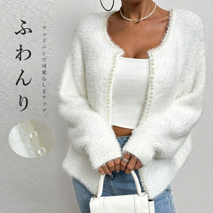 今年らしいパールづき×フェザーヤーンシャギー ニットカーディガン ショート丈 羽織り物 おしゃれ 体型カバー 大人 トレンド感 春 秋 冬