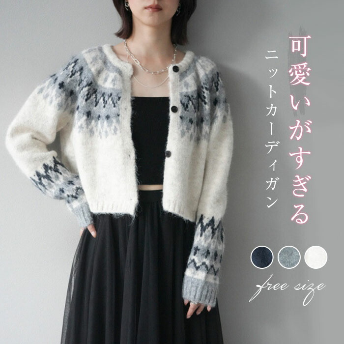 カーディガン ニットカーディガン レディース 秋冬 ニット セーター 可愛い ニットセーター ショート カーデ 前開き きれいめ 菱形 クルーネック 羽織り アウター カットソー ニットカーデ 重ね着