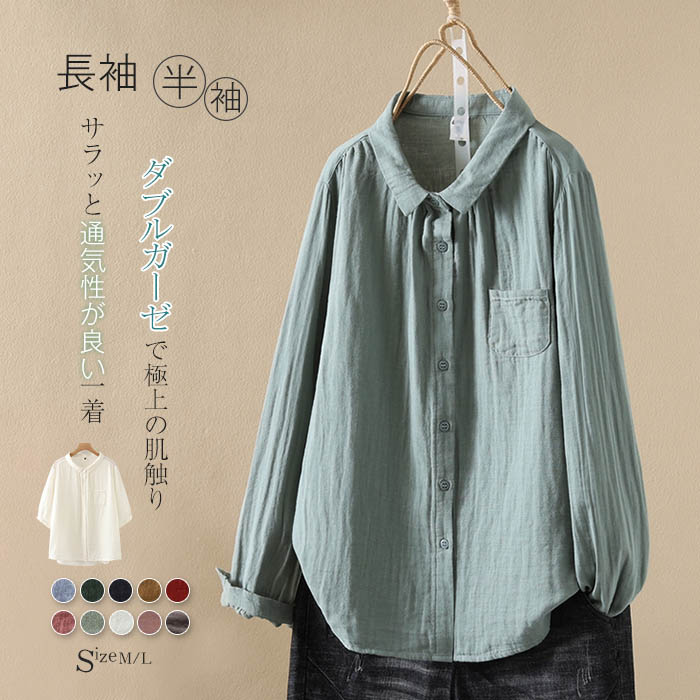 ガーゼシャツ レディース 長袖 半袖 ガーゼ シャツ ダブルガーゼ シャツブラウス トップス 春秋 春 夏 秋 冬 通気性 吸湿性 2重ガーゼ ガーゼブラウス 大人 カジュアル 白シャツ