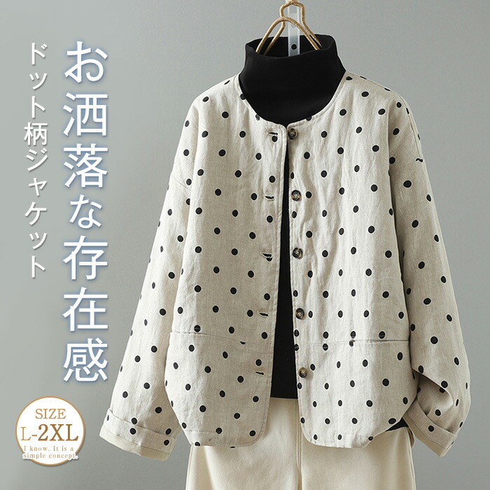 コート レディース ドット柄 水玉 ジャケット 秋冬 秋 冬 長袖 軽い ライトコート 羽織り 薄中綿 アウター ノーカラー 暖かい 防寒 あったか カジュアル ナチュラル 大人 大きいサイ おしゃれ