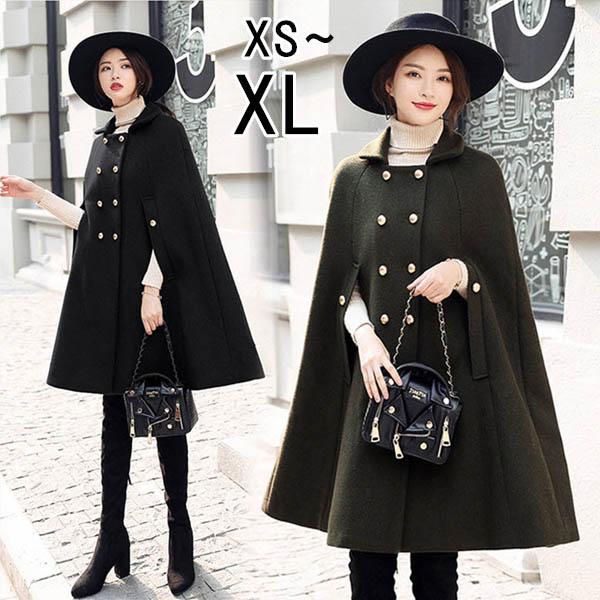 ケープ コート マント ミディアム丈 ボア有り ポンチョ アウター 大きめ ゆったり 小さいサイズ 韓国風 秋冬 防寒 体型カバー おしゃれ フェミニン 通勤 暖かい 黒 カーキ XS M L X S