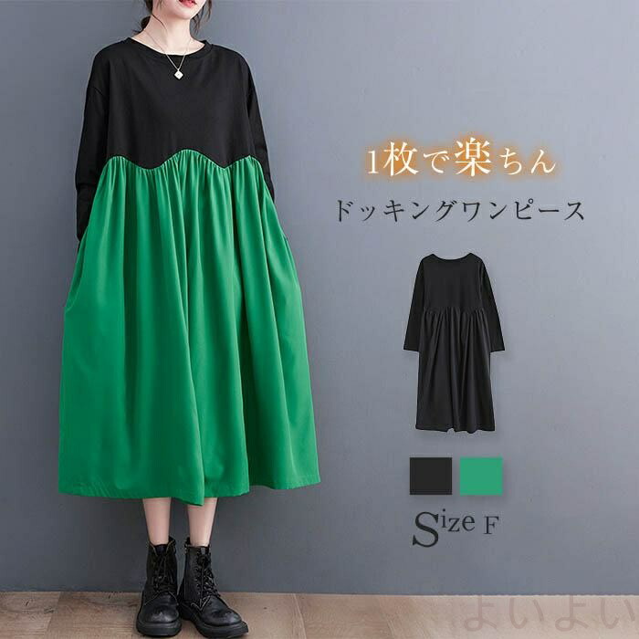 ワンピース レディース ロングワンピース 長袖ワンピース Aラインワンピース 長袖 春 春秋 ロング ロング丈 Aライン 丸襟 ギャザー ドッキング ラウンドネック