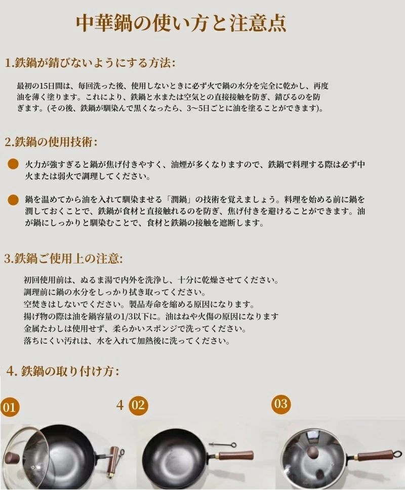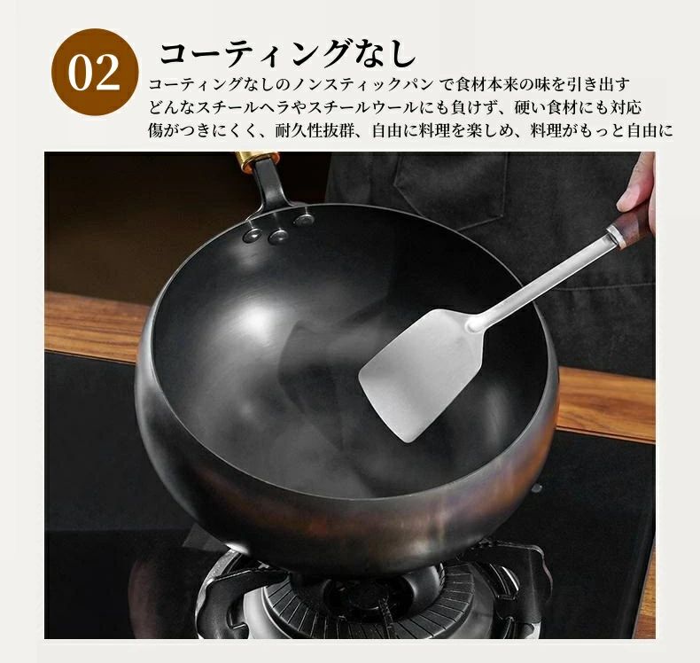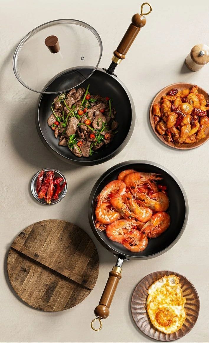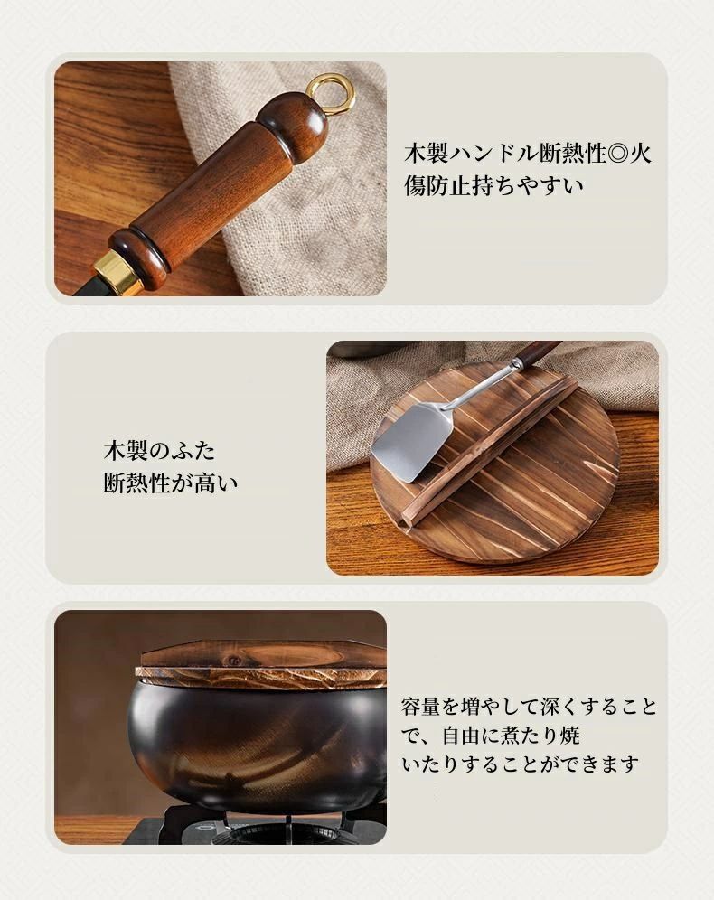 フライパン 鉄鍋 鉄製中華鍋 中華鍋 シングルポット 木蓋付き ガラス蓋付き 24cm 26cm 28cm 30cm