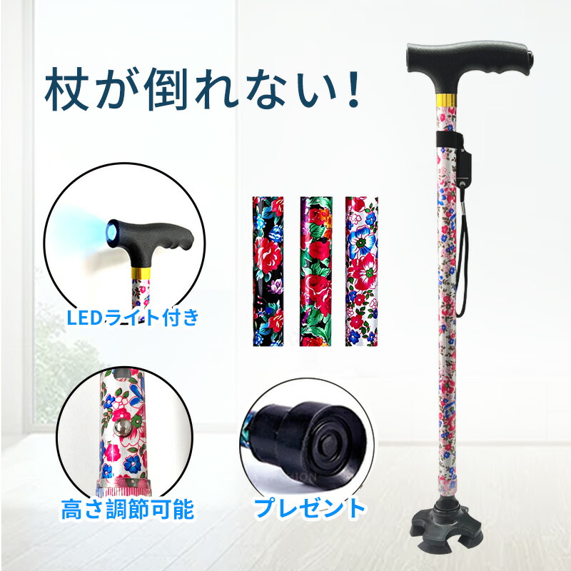 ステッキ 自立式 LEDライト付き 女性用 高齢者 自立 ステッキカバー 杖 男性用 伸縮 滑り止め 4本足 歩行器 介護杖 軽量 長さ調節可能 ギフト 孫 便利グッズ お年寄り老人用杖 母 介護用品