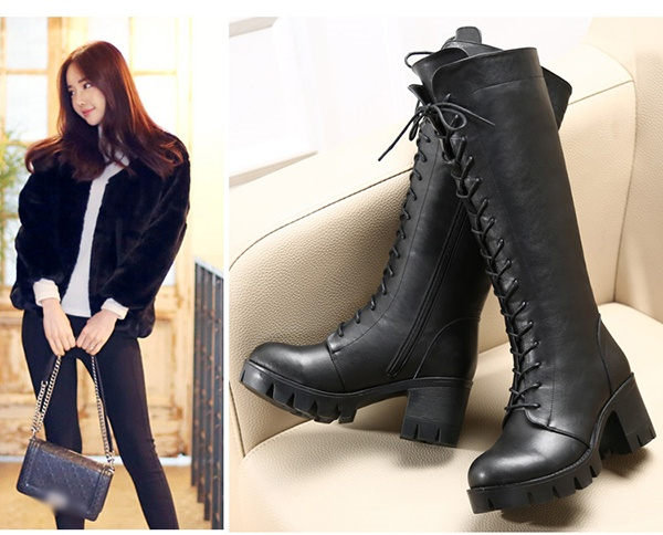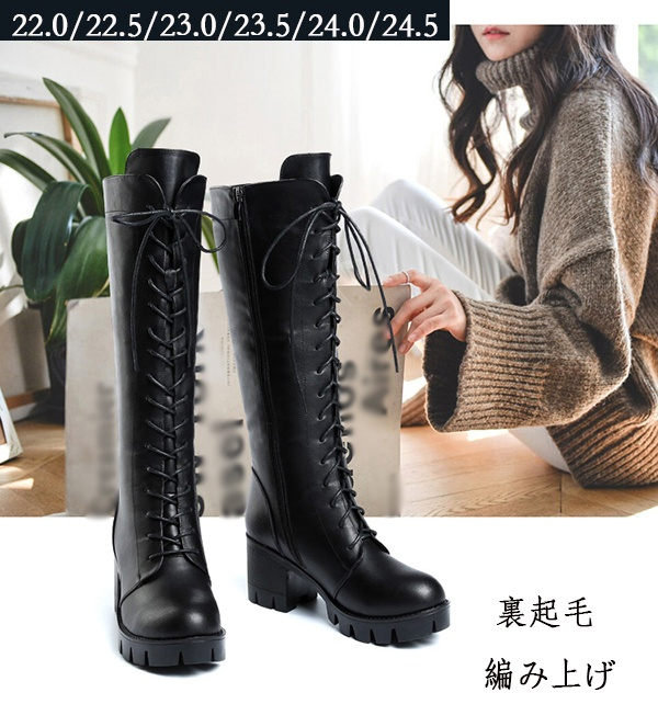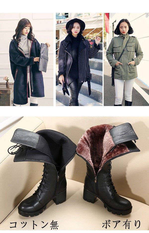 ヒール7cm ミドルブーツ 編み上げ レディース靴 レインシューズ 長靴 ブーツ 通販 ブラック( コットン無) ブラック( ボア有り) 22.0 22.5 23.0 23.5 24.0 24.5