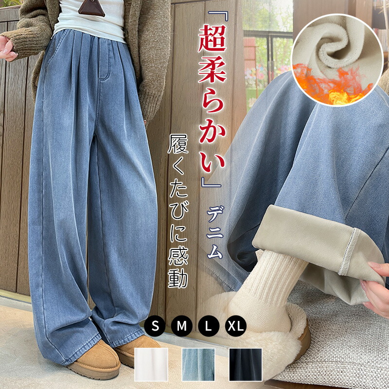 感謝祭限定2点以上10%OFFワイドパンツ デニム 裏起毛テンセル 体型カバー ゴム レディースパンツ リヨセル テンセル 疲れない カジュアル ゆったり ブラック ブルー ホワイト M L XL S