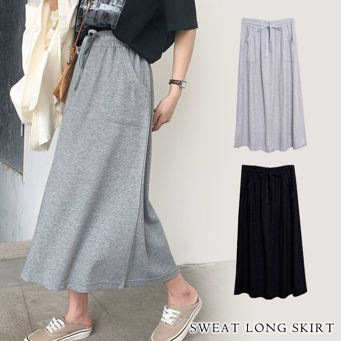 スカート レディース 春 夏 春夏 黒 スウェットスカート ロング フレアスカート ロングスカート ミモレスカート ミモレ丈 ミディアム ウエストゴム ブラック グレー 20代 30代 40代