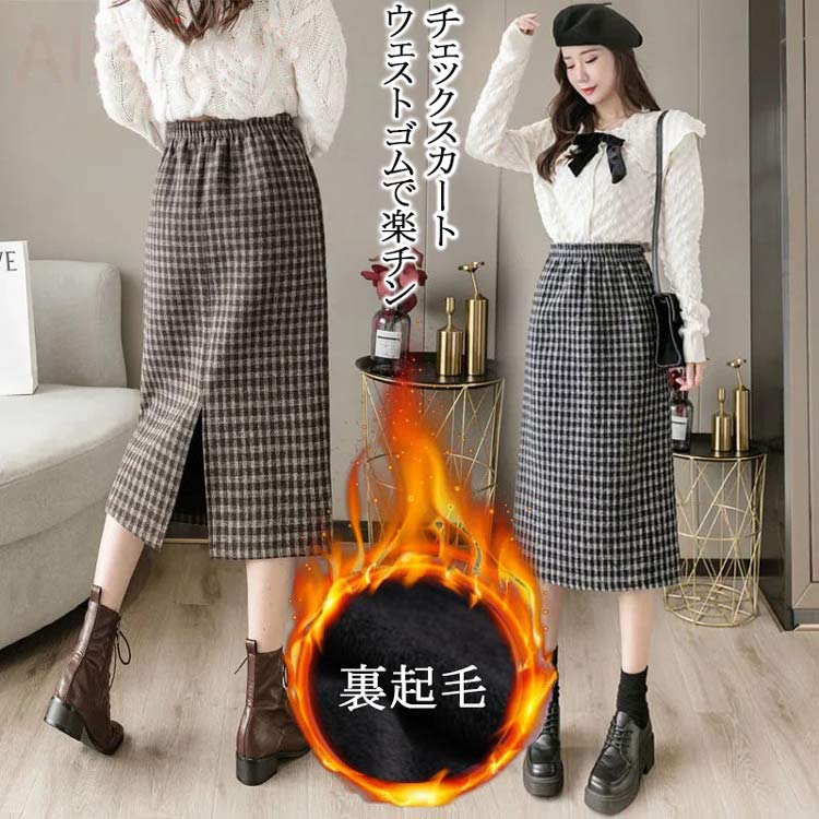 裏起毛 チェック柄 スカート 秋冬 レディース チェックスカート ロング ウェストゴム バックスリット タイトスカート チェック ハイウェスト 裏起毛スカート 2type選べる 裏ボア 防寒 暖かい