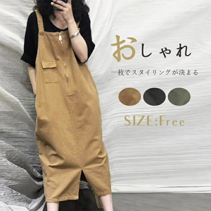 ジャンパースカート レディース 夏 春秋 ワンピース ロング丈 コクーンワンピース ミモレ丈 スリット ジャンスカ ロングワンピース サロペット ゆったり 無地 ポケッ ノースリーブ