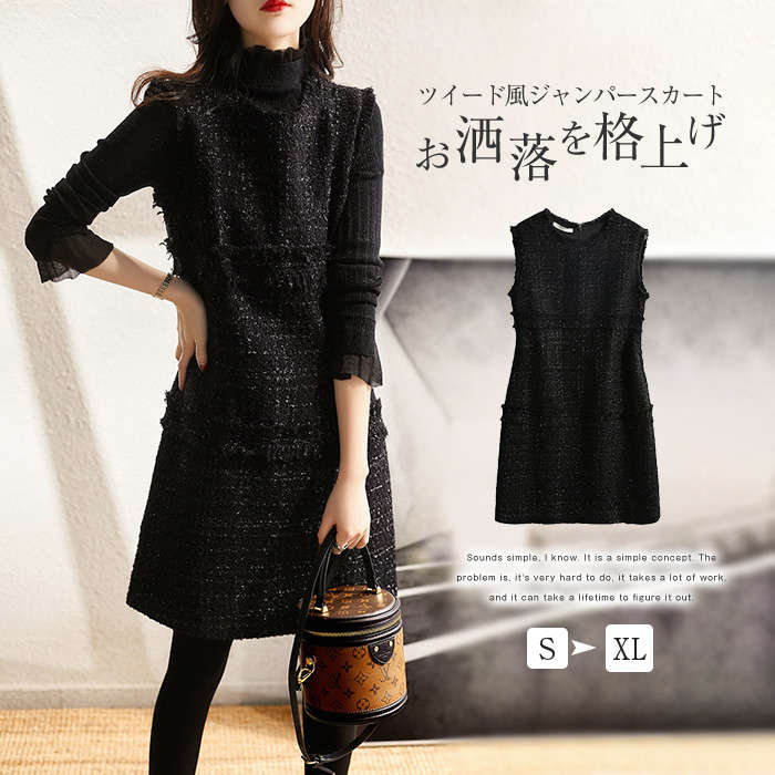 ジャンパースカート ツイード風 春 秋 レディース ノースリーブ クルーネック スカート ジャンスカ 膝丈 ツイード 女性 きれいめ 重ね着 大きいサイズ おしゃれ レイヤード カジュアル 通 可愛い