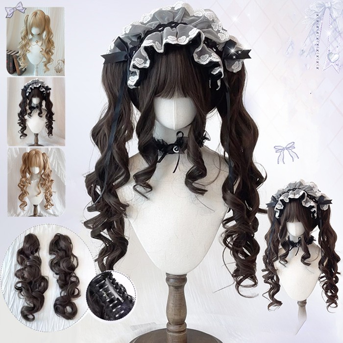 ロリータ ウィッグ ロング カール ツインテール フルウィッグ バンスクリップ付き 前髪あり ふんわり 耐熱 コスプレ メイド ロリータファッション 撮影用 ブラック ブラウン 金髪 衣装用