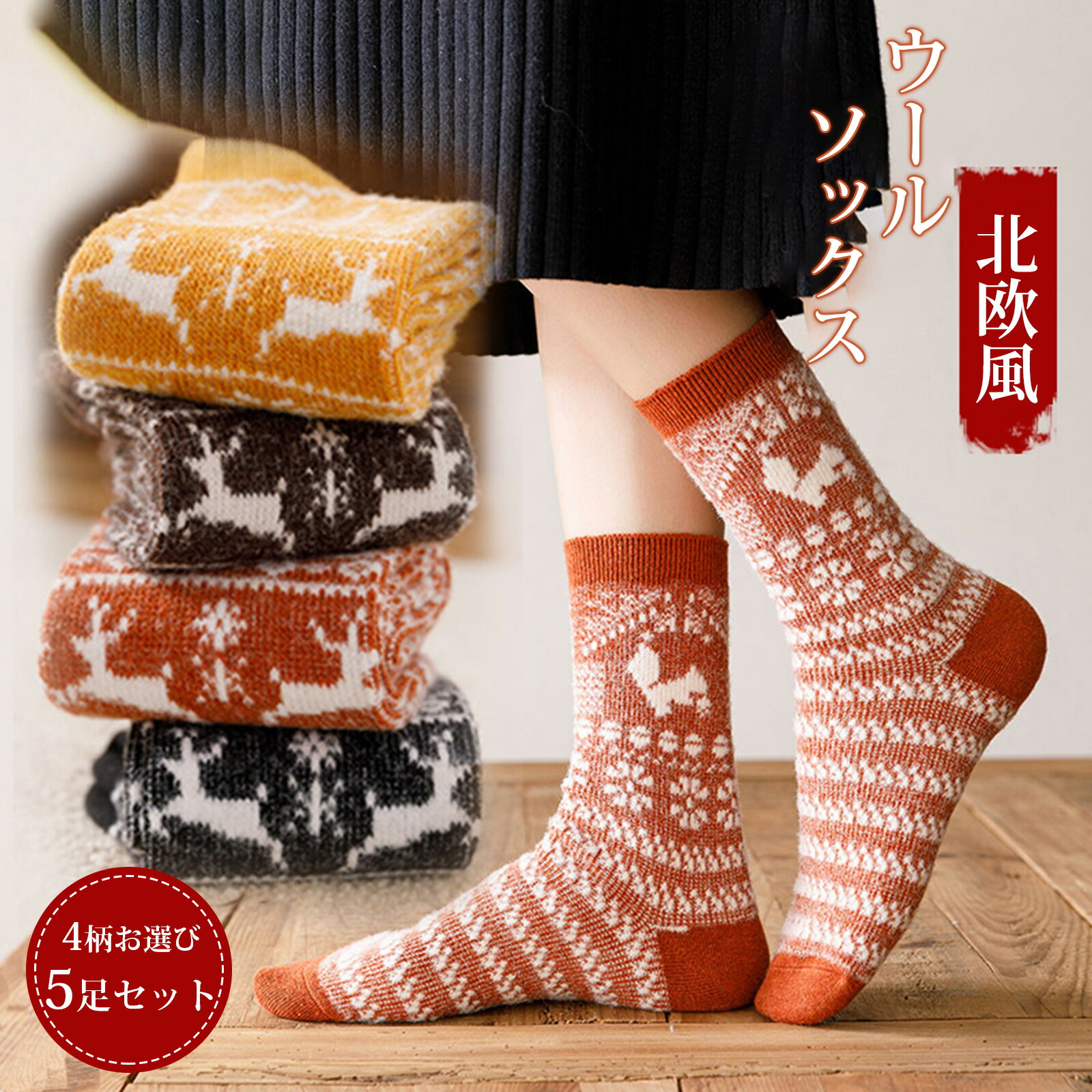 冬の冷え対策に最適なウール混の暖かいレディース靴下。北欧柄の5足セットで気分も上がる もこもこ厚手で足元ぽかぽか 室内外どちらでも使える万能ソックス 22-26対応