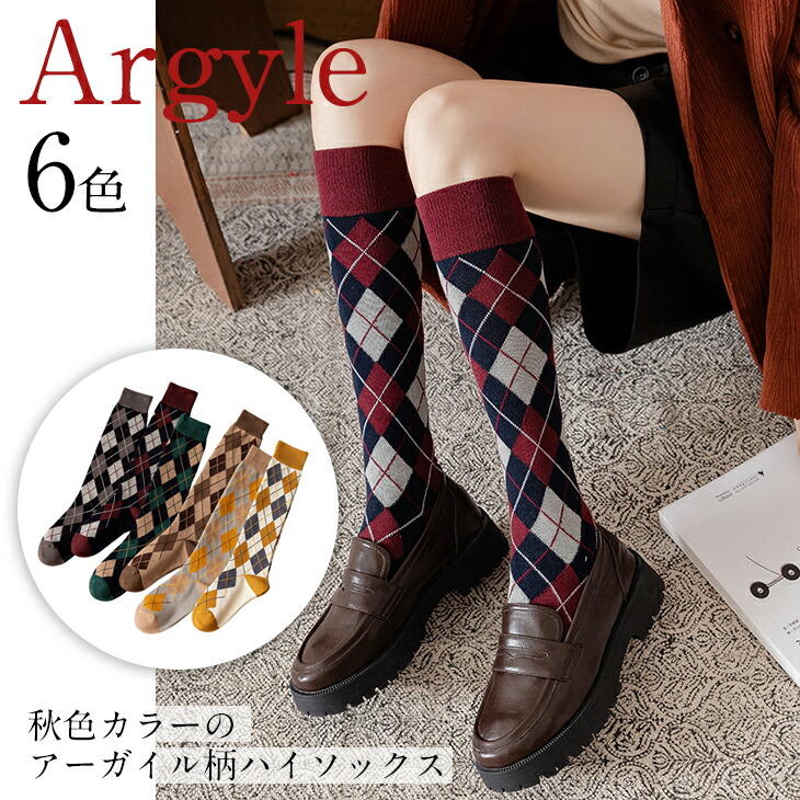 6カラー アーガイル柄 ハイソックス 学生 靴下 レディース ジュニア リブ おしゃれ トラッド ビンテージ レトロ かわいい スニーカー お出掛け 色違い お揃い おそろ 秋冬 送料無料