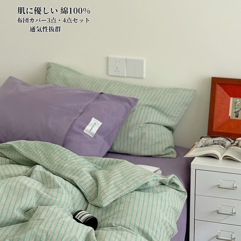 ストライプ 布団カバー 布団カバーセット 緑 ストライプ柄 北欧 掛ふとんカバー 3点セット 4点セット シングル ダブル クイーン ボックスシーツ フラットシーツ 通気性 柔らか 掛け布 綿100%